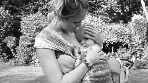 Ganz wichtig ist natürlich „richtiges“ Tragen in korrekter Anhock-Spreiz-Haltung und mit guter Unterstützung der natürlich gerundeten Form der Wirbelsäule von Säuglingen!